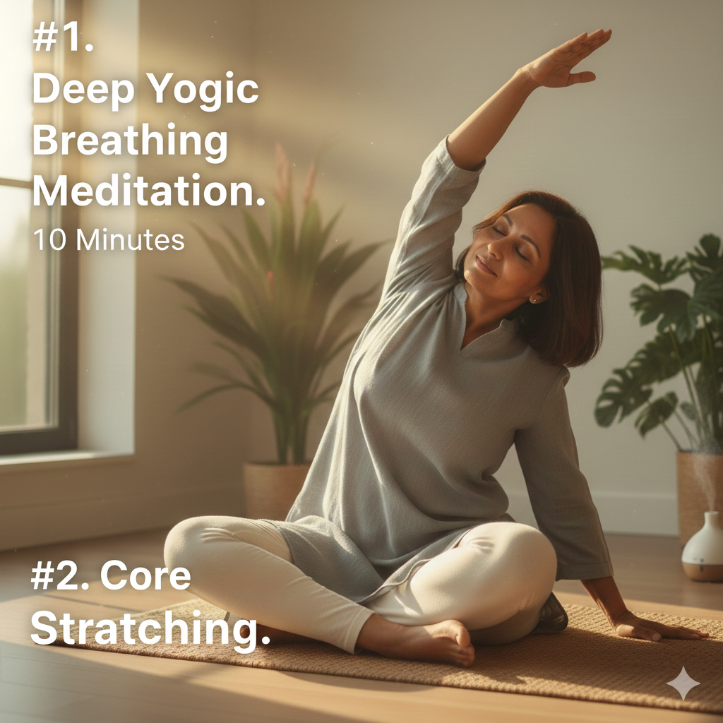 Before you move, you must breathe. Deep diaphragmatic breathing activates the deep core and lowers cortisol (the stress hormone linked to belly fat).